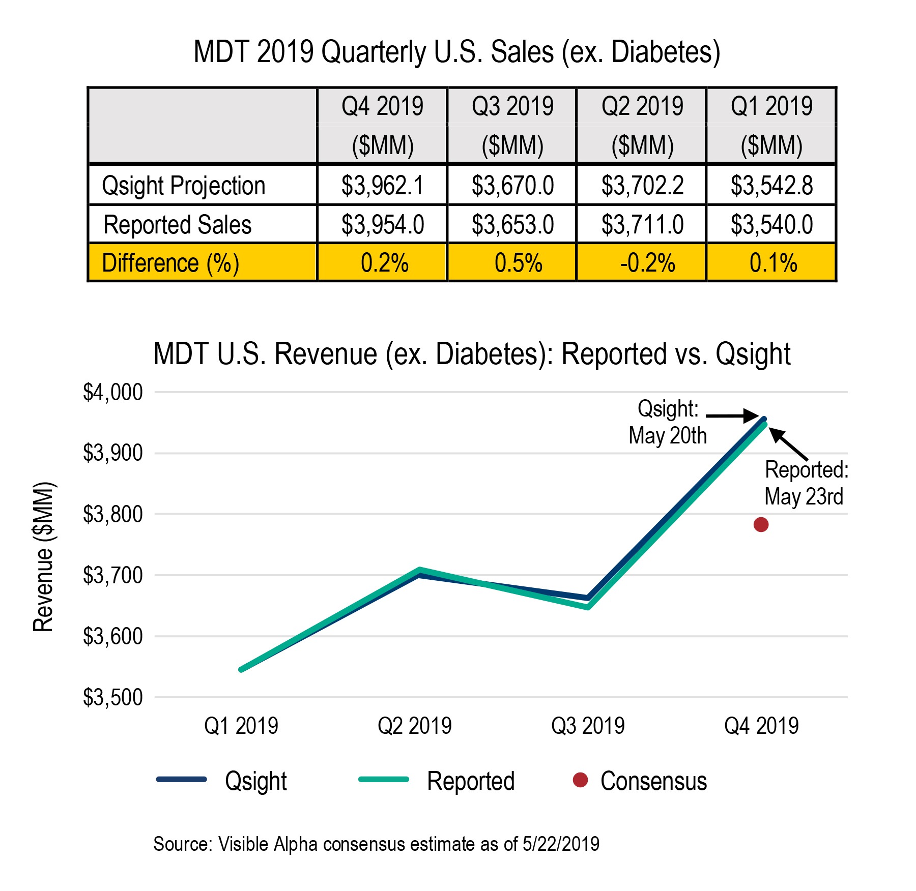 5 月 23 日,MDT 的 19 财年第四季度报告称,美国销售额超过了华尔街的预期,导致股价第二天上涨了 +3%。 以下是 Qsight 的销售预测与报告结果的比较: