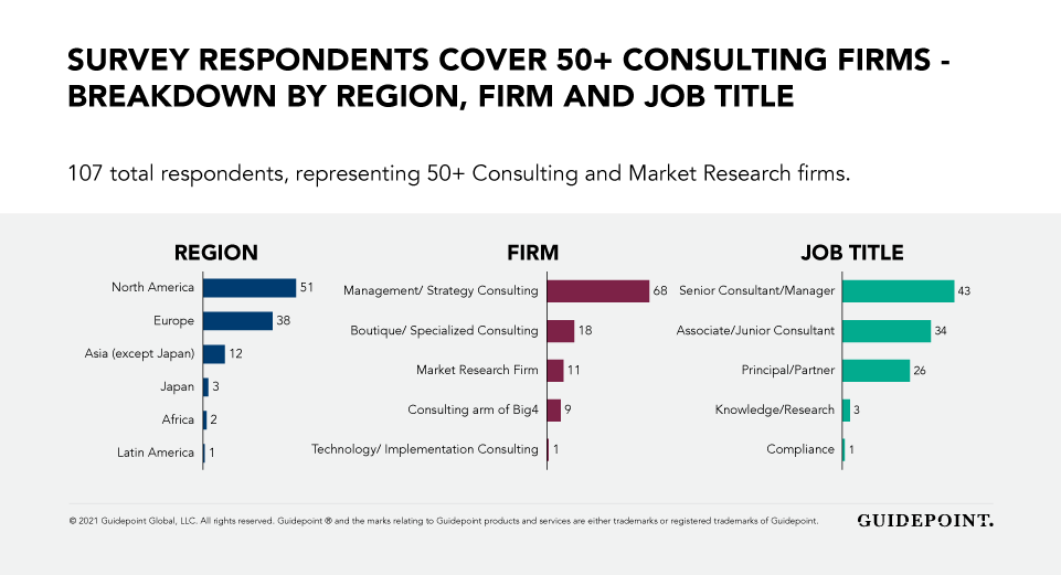 为了了解在当前环境下如何利用专家网络并获得改进我们服务所需的知识,Guidepoint 调查了专家网络用户,涵盖所有地理区域的 50 多家咨询和市场研究公司,其工作职能范围从初级顾问到负责人和合作伙伴以及研究/知识团队。