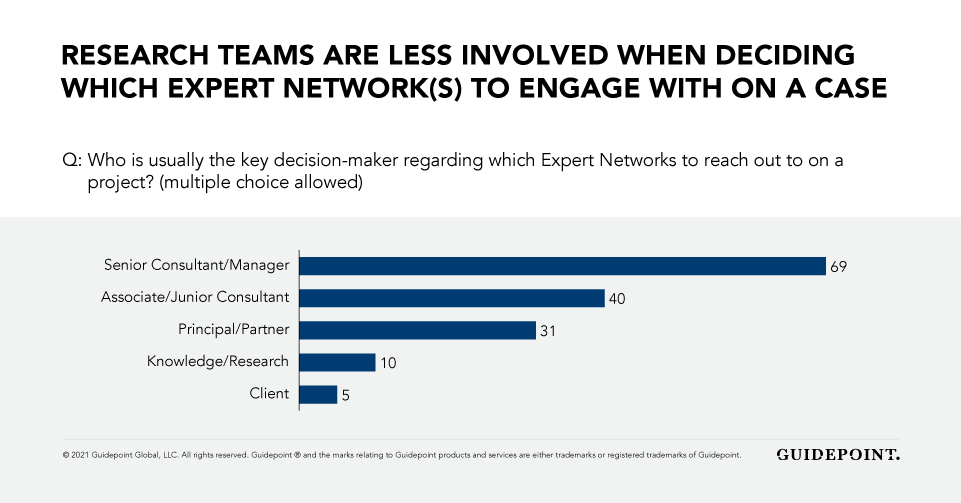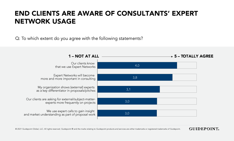 尽管如此,最终客户对通过 Expert Networks 提供的外部研究能力有何看法?根据 Guidepoint 的客户调查结果,五分之四的人同意最终客户知道他们公司的专家网络使用情况,而五分之三的人同意越来越多的客户要求专家网络经常参与咨询项目。