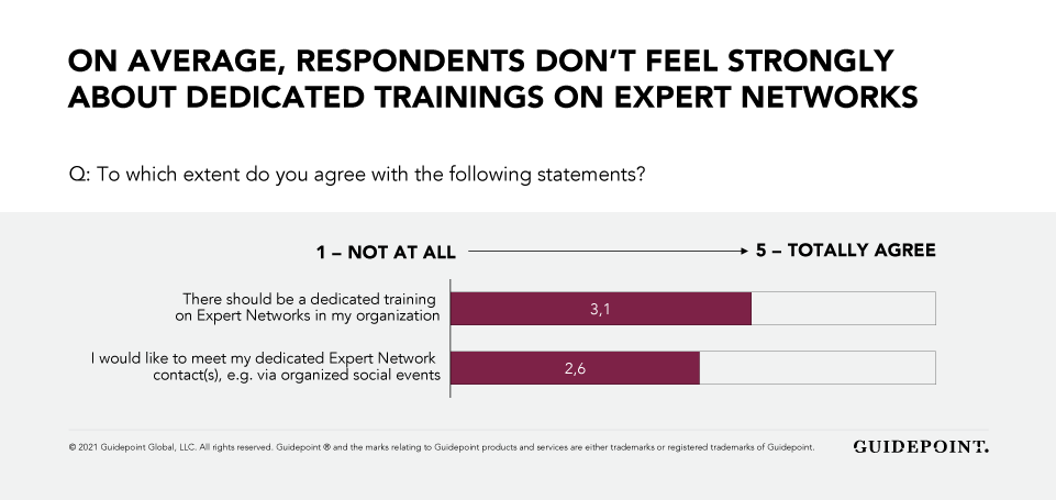同时,对于大多数 Expert Networks 来说,与咨询公司建立一致且值得信赖的工作关系仍然是一个挑战。虽然我们已经看到了 Guidepoint 研究团队和客户之间正式(或社交)会议的价值,但调查受访者对此类会议持中立态度(5 分中的 2.6 分同意)。