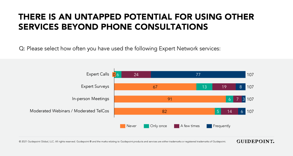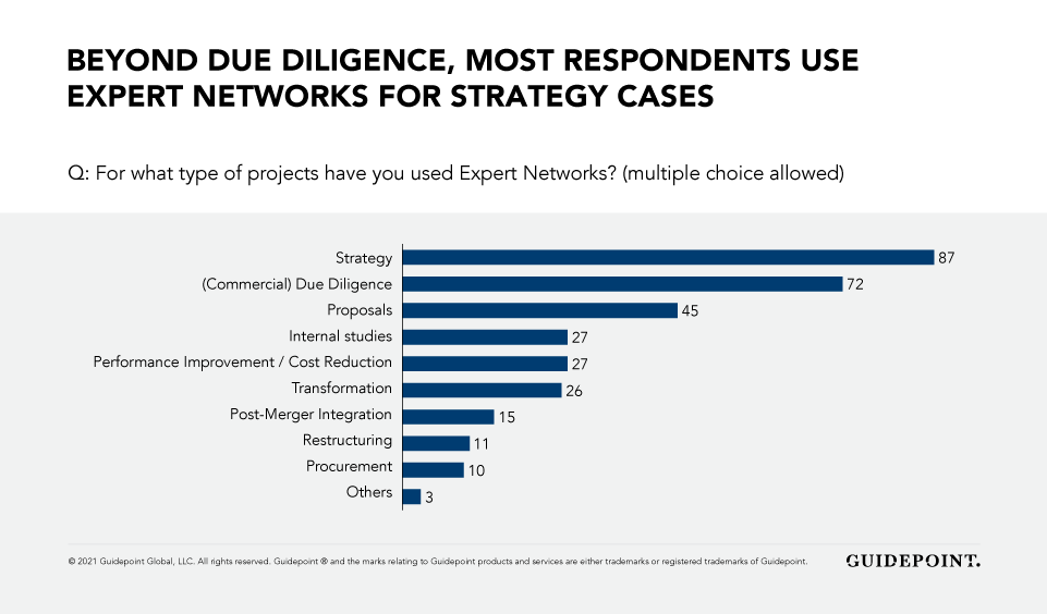 也许最出乎意料的发现之一是,代表最终客户进行尽职调查工作不再是 Expert Calls 的主要原因。87 名受访者表示,他们使用 Guidepoint 等服务提供商的 Strategy 案例,这使其成为领先于尽职调查案例 (72) 的第一个用例。
