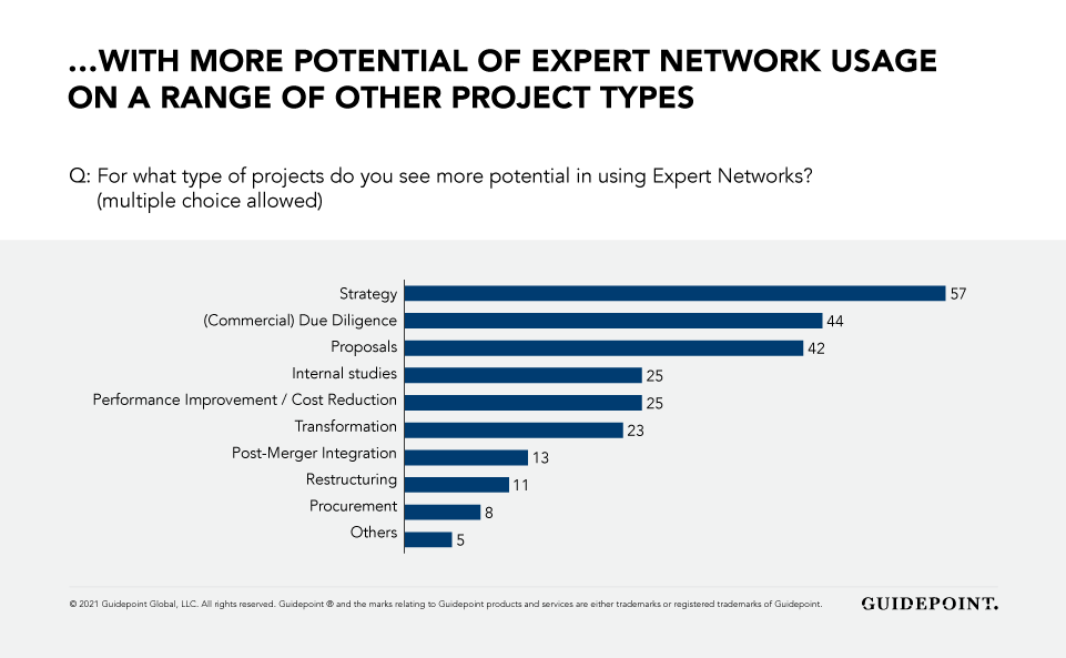 当被问及他们希望在哪种类型的咨询项目中增加专家网络的使用时,57 名受访者提到了战略案例,42 个提到了提案工作,其次是内部研究 (25)、绩效改进/成本降低 (25) 和转型项目 (23)。