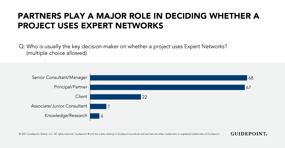 当被调查项目是否使用 Expert Network 服务的关键决策者是谁时,67% 的受访者表示,决策主要取决于合伙人/负责人,经理/高级顾问也做出了类似的决定。