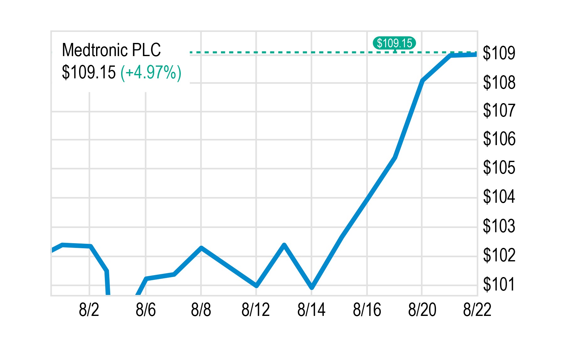 如您所知,MDT 报告了他们的 20 财年第一季度收益,美国销售额高于卖方共识,这导致截至美国东部时间上周二(8 月 20 日)上午 10:30,该股开盘上涨 +4.97%。