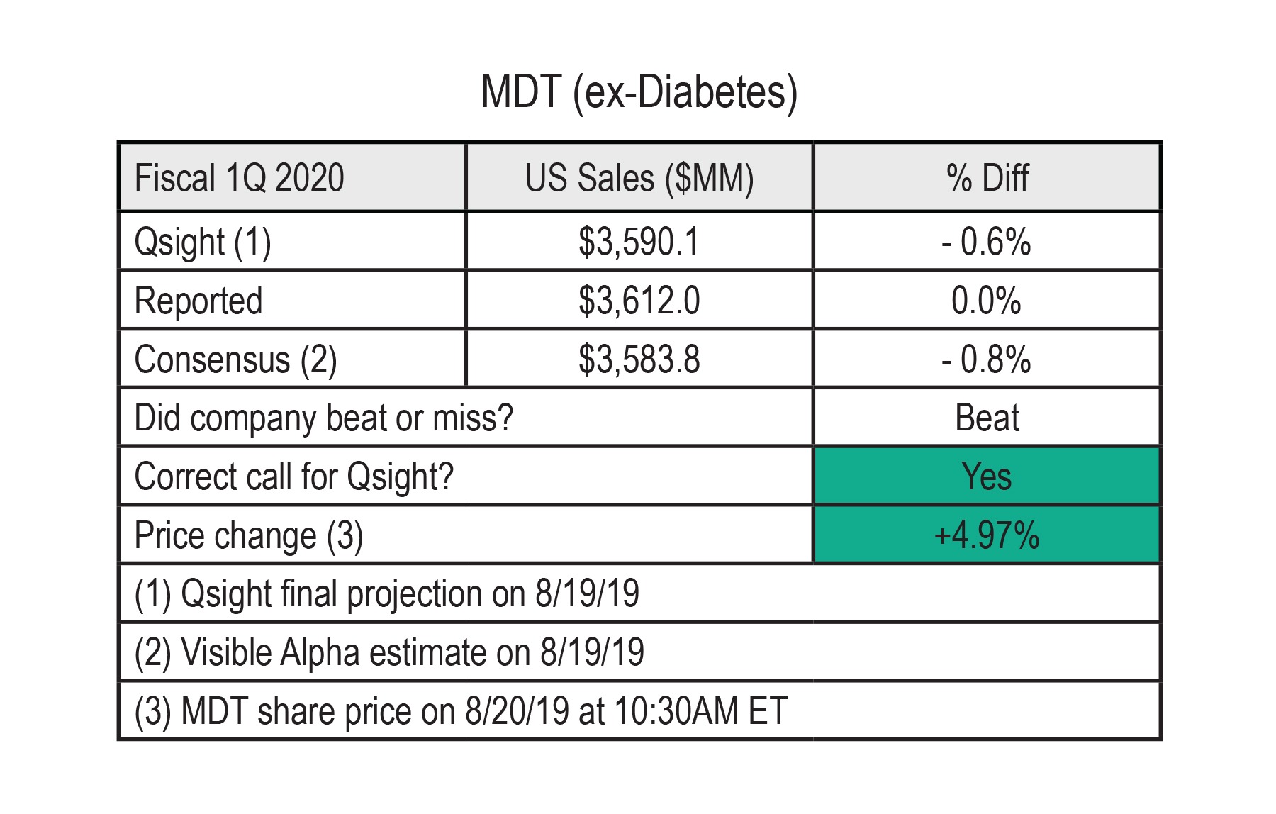 虽然卖方估计表明 MDT 在美国的销售增长将弱于前几个季度,但 Qsight 预测 2Q19 的情况有所不同。从 2019 年 7 月开始,Qsight 的数据和预测方法开始显示出潜在的实力,预计销售增长趋势高于普遍预期。8 月 19 日,Qsight 对 MDT 的最终预测暗示与共识相比有节拍,并被证明是准确的。回顾如下: