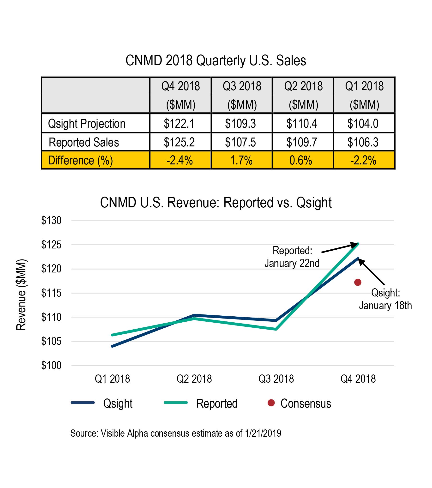 对于 CONMED,Guidepoint Qsight 的数据和预测方法在过去 4 个季度中每个季度都比市场普遍认为的更准确。最值得注意的是,在 CNMD 发布 2018 年第四季度财报之前,Qsight 的数据和预测方法显示,其美国收入有可能高于卖方的普遍预期。1 月 22 日,CNMD 的 2018 年第四季度报告称,美国销售额超出华尔街的预期,导致股价在第二天开盘时上涨了 +5%。