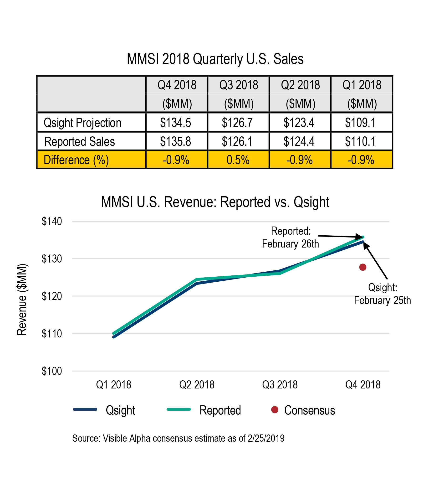 对于 Merit Medical,Guidepoint Qsight 的数据和预测方法在过去四个季度中每个季度都比市场普遍认为的更准确。最值得注意的是,在 MMSI 发布 2018 年第四季度收益之前,Qsight 的数据和预测方法显示,其美国收入有可能高于卖方的普遍预期。2 月 26 日,MMSI 2018 年第四季度报告称,美国销售额超出华尔街预期,导致股价在第二天开盘时上涨了 +7%。