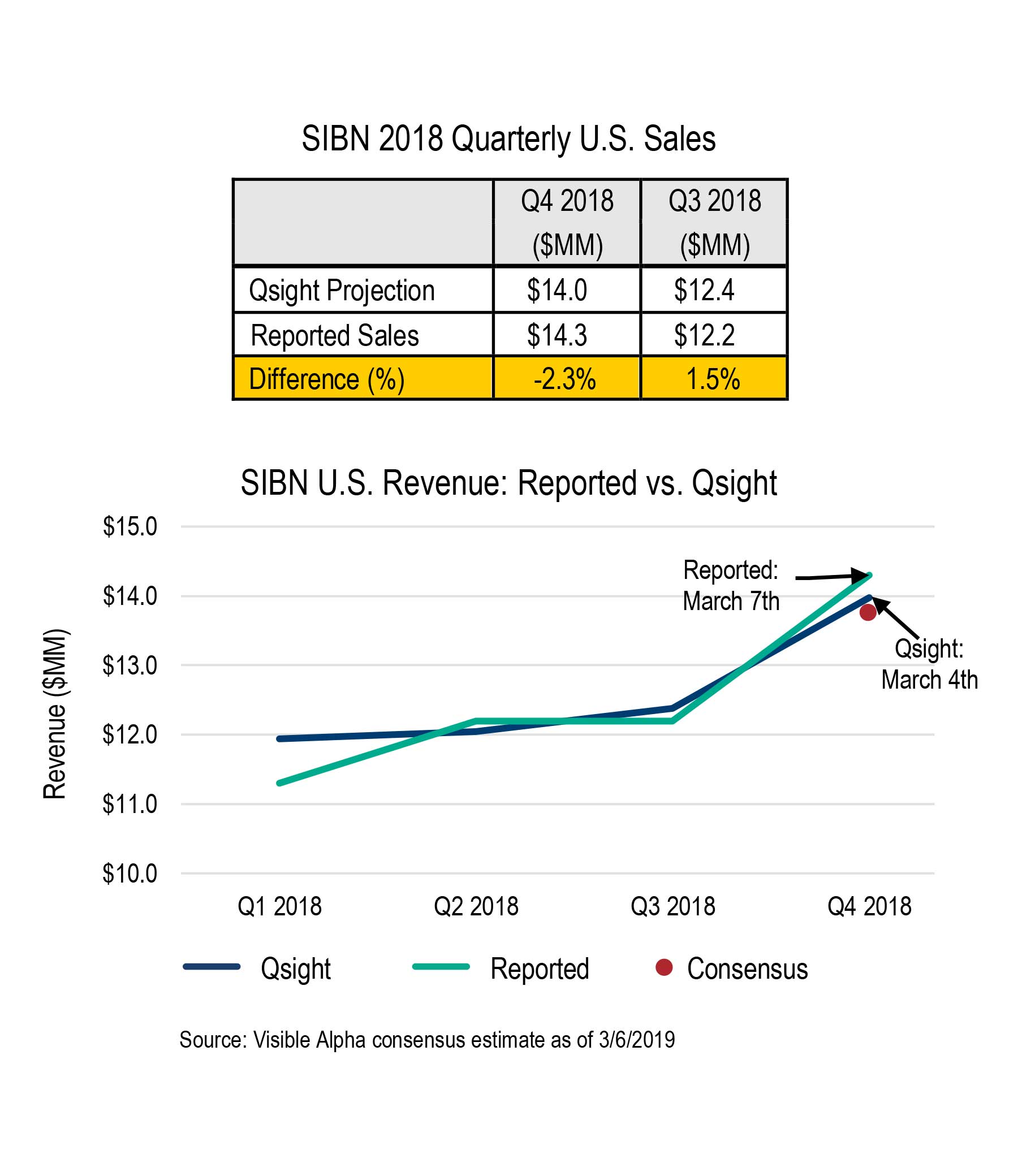 在 SI-BONE 发布 2018 年第四季度财报之前,Qsight 的数据和预测方法显示,其美国收入有可能高于卖方的普遍预期。3 月 7 日,SIBN 的 2018 年第四季度报告称,美国销售额超出华尔街的预期,导致股价在第二天的高位上涨了 +5%。
